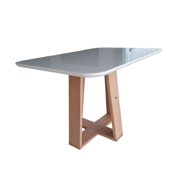 Vidro colado e pintado sobre o MDF, com espessura de 3mm (para mesas até 1,80m) ou 4mm (acima de 2,00m), garantindo resistência e segurança.